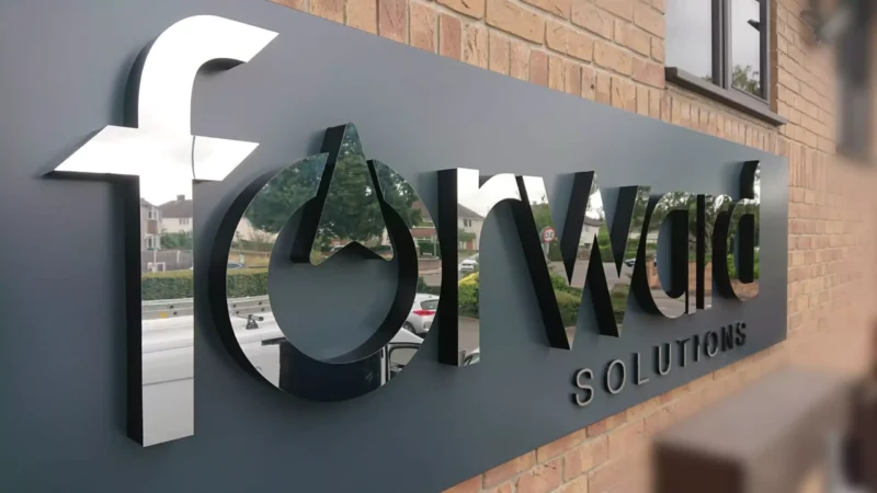Exterior company signs with acrylic, metal ya wood. Weather proof aur highly visible.